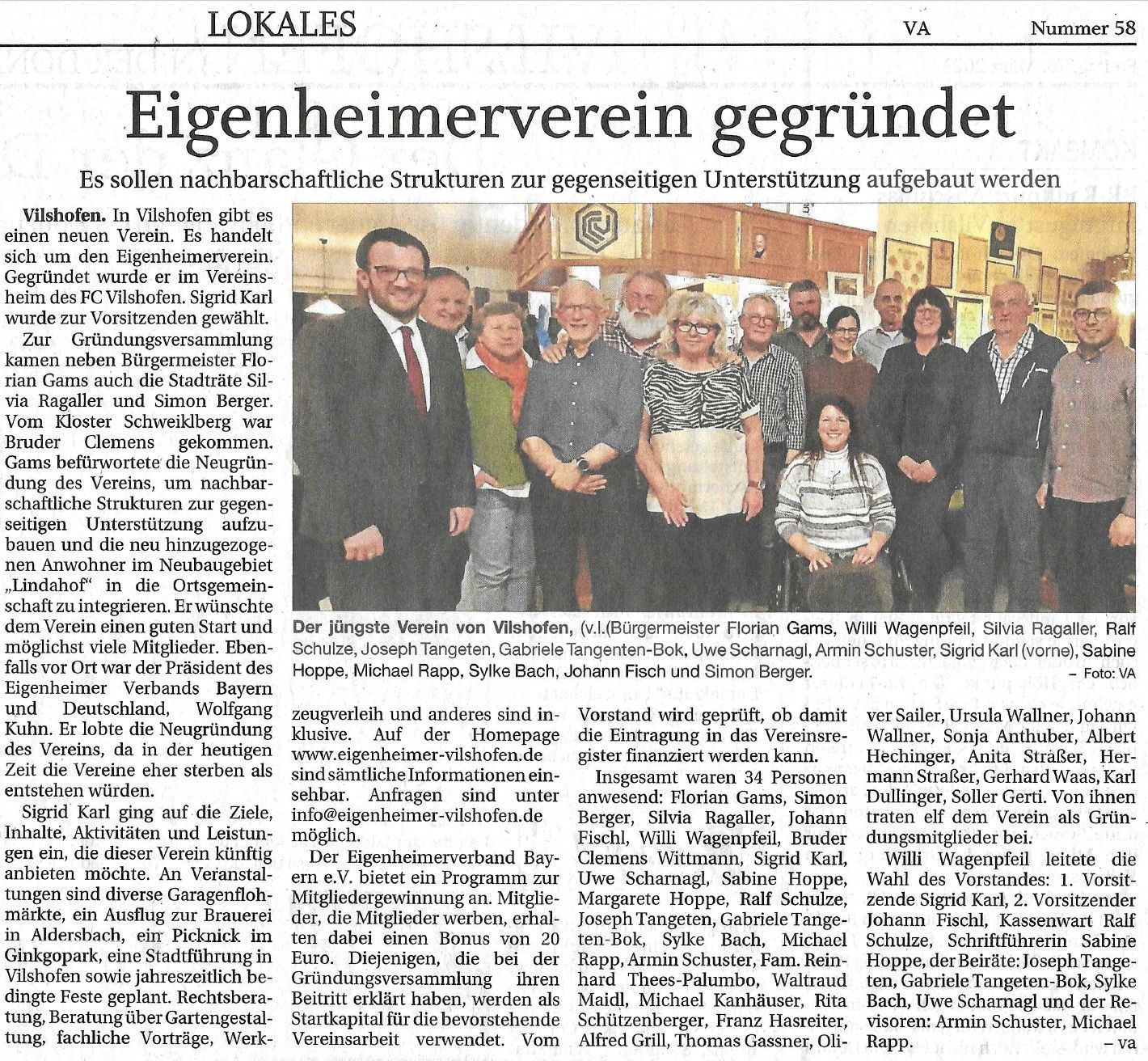 Der Verein Eigenheimer Vereinigung Vilshofen e.V. wurde erfolgreich gegründet.